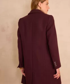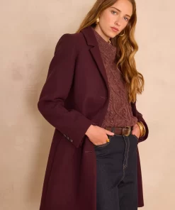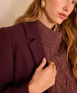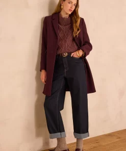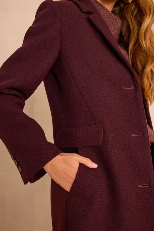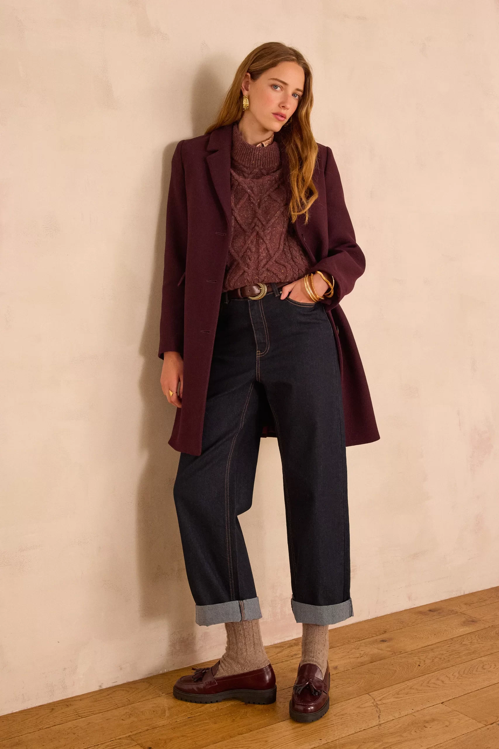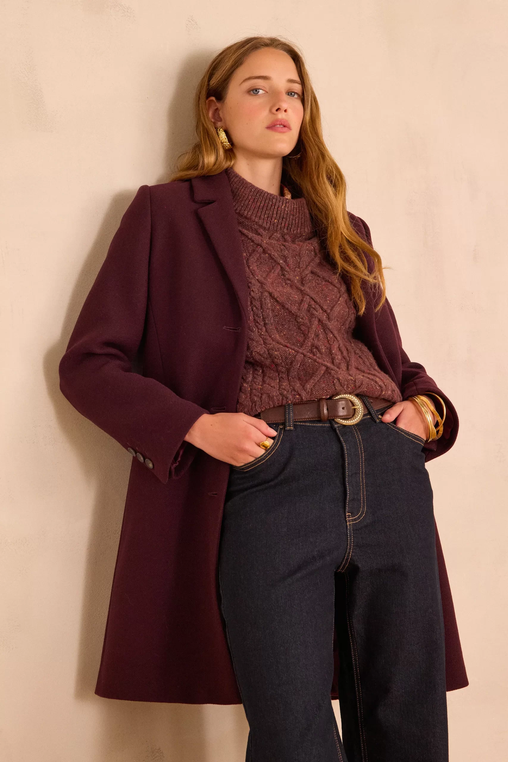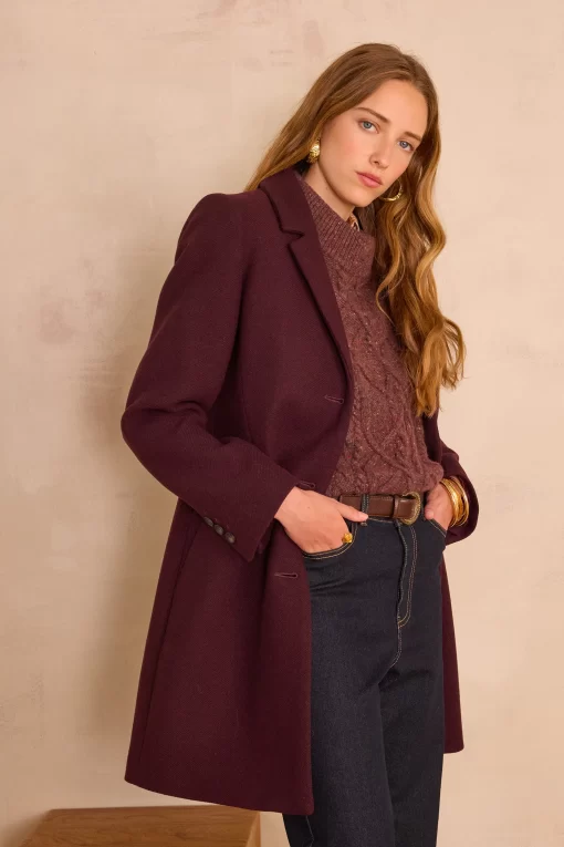 Pair this burgundy coat with a tone-on-tone cable-knit jumper and raw jeans for an elegant and warm look, perfect for winter.