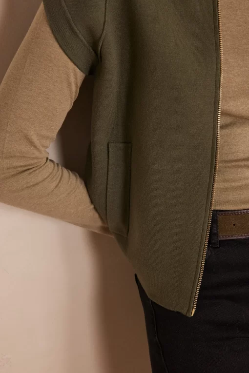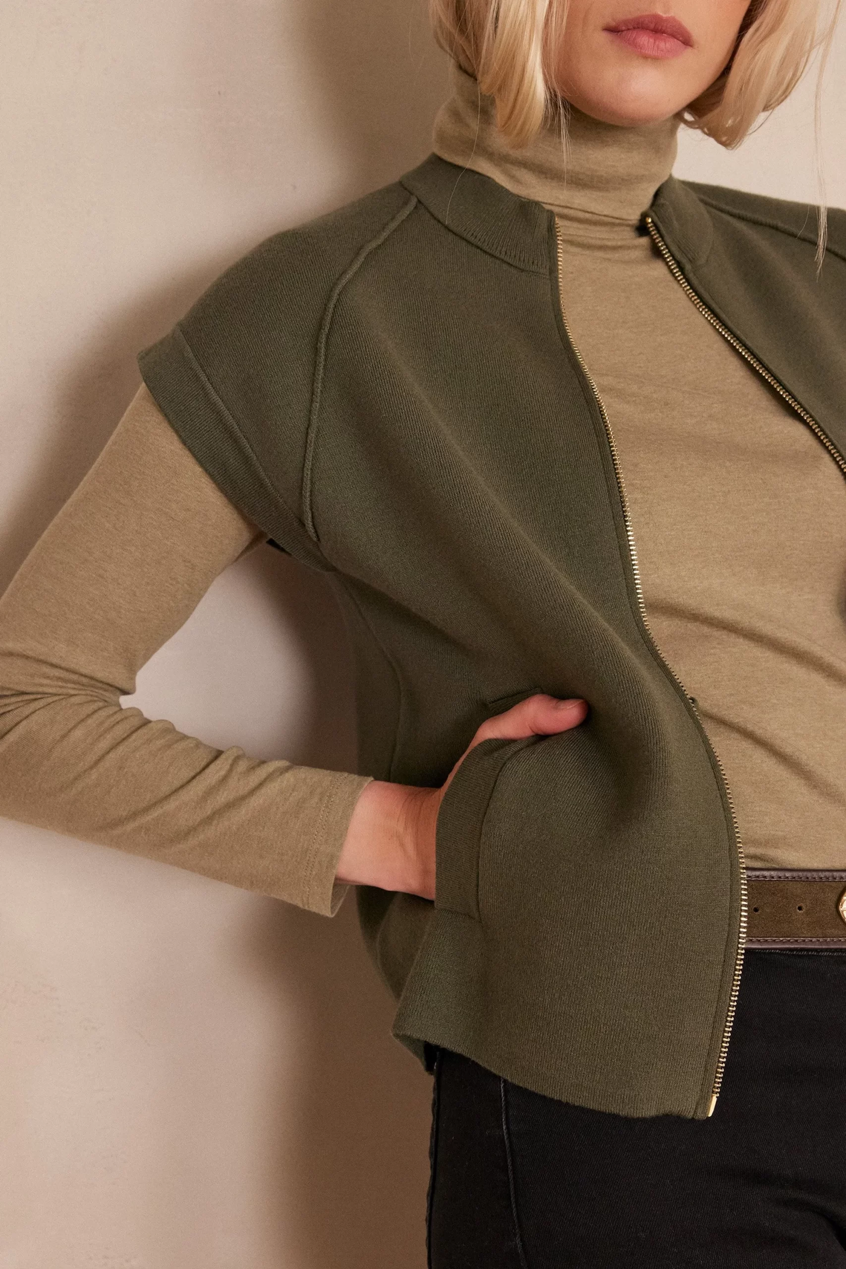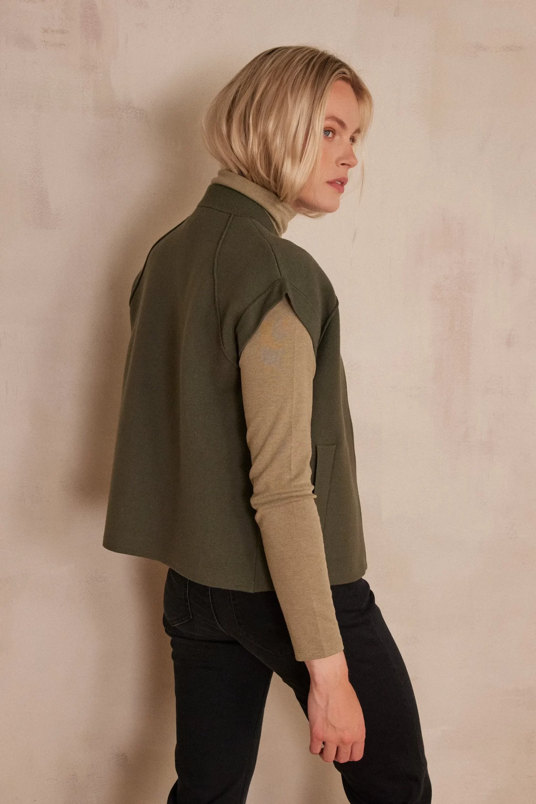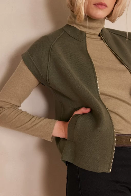 This sleeveless jacket captivates with its khaki shade and structured cut, adding a modern and elegant touch to all your outfits.