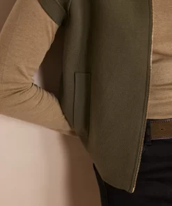 Play with shades of khaki by wearing this jacket over an almond green turtleneck, accompanied by a golden khaki belt for a look that's both chic and harmonious.