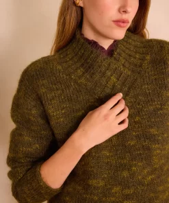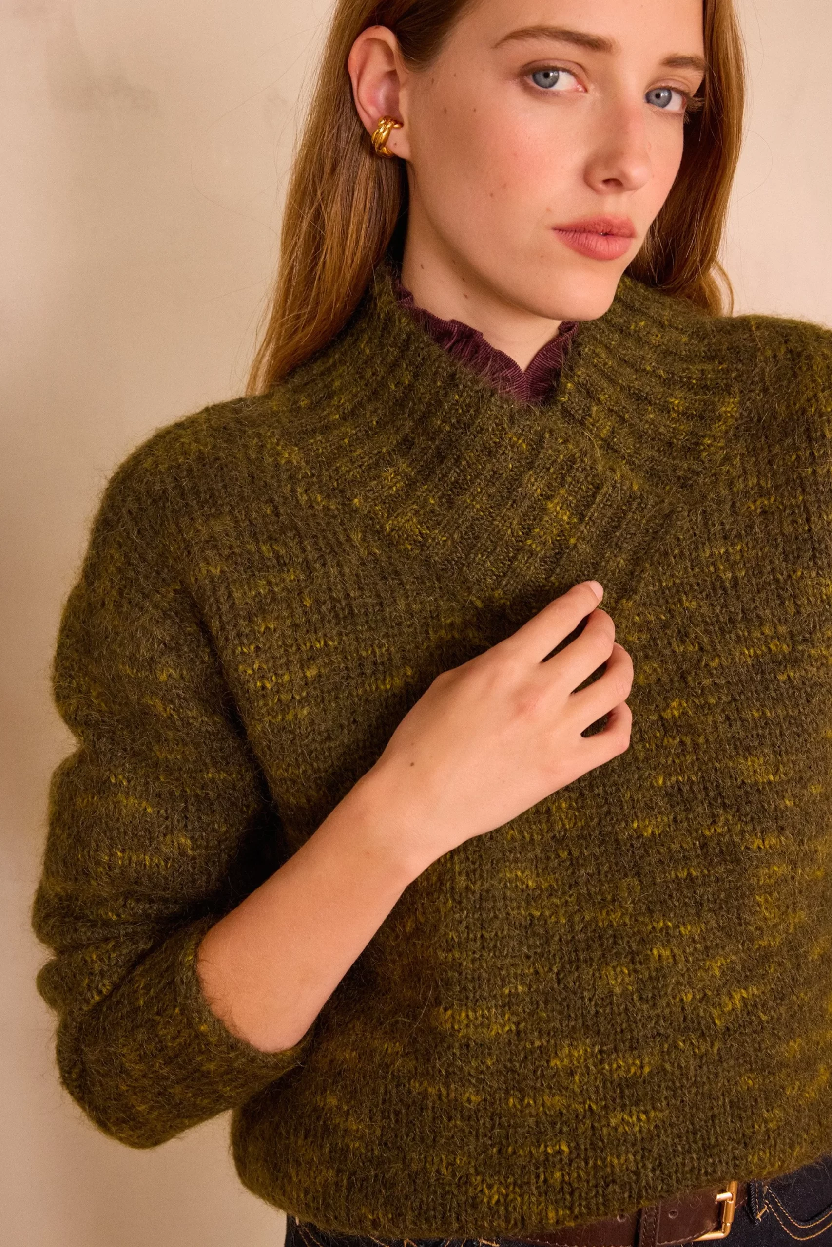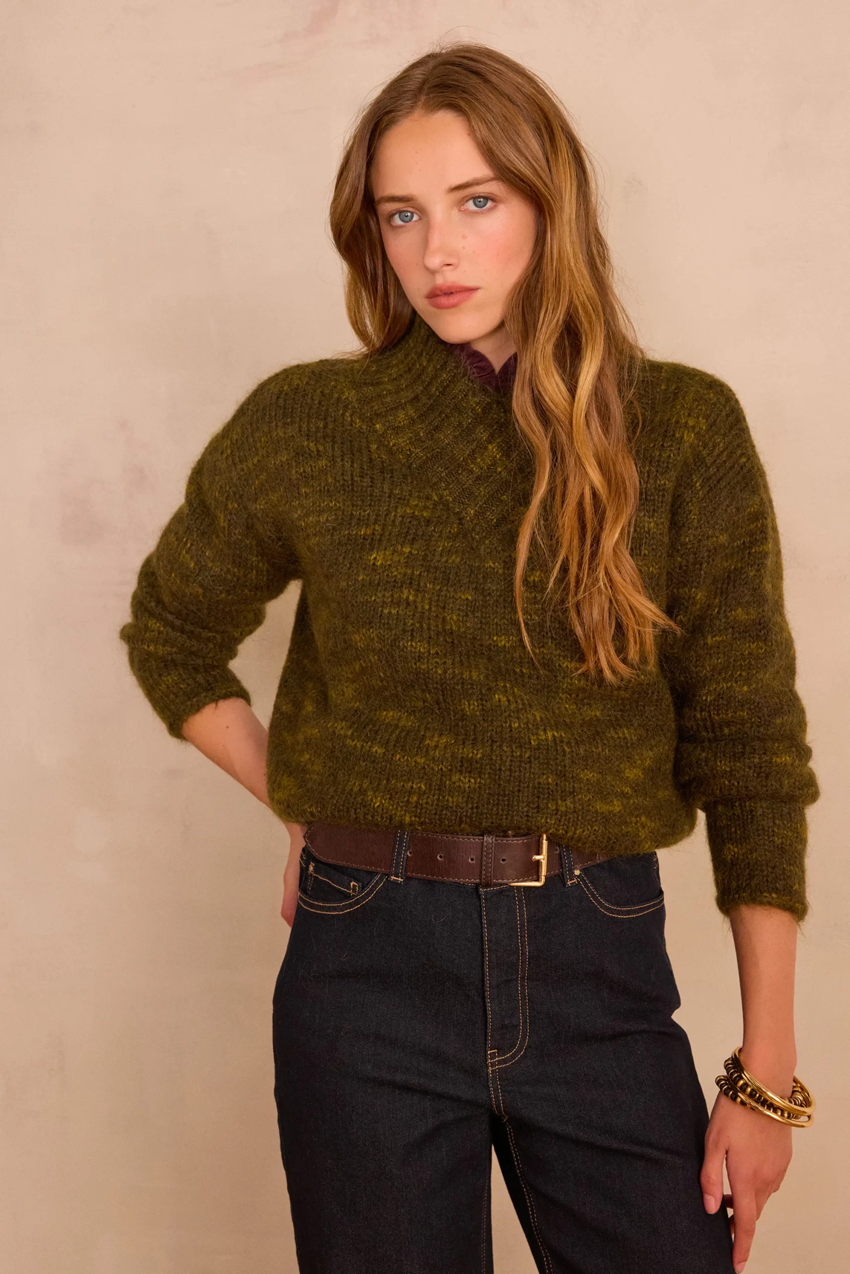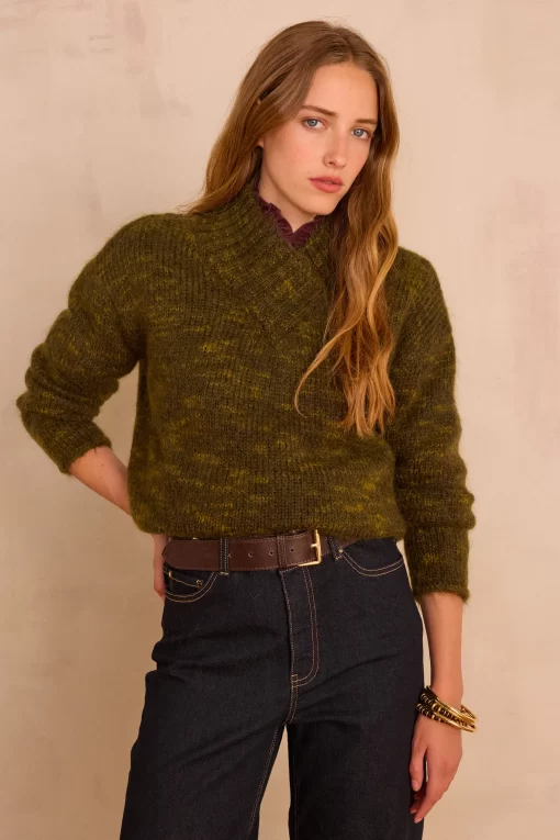 Go for a contrast of textures by slipping this wrap collar jumper over a fluid high-neck blouse, and complete with raw jeans or a leather midi skirt to balance softness and structure.