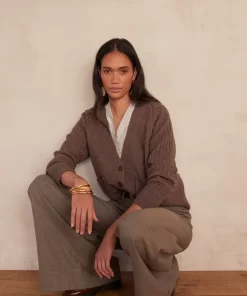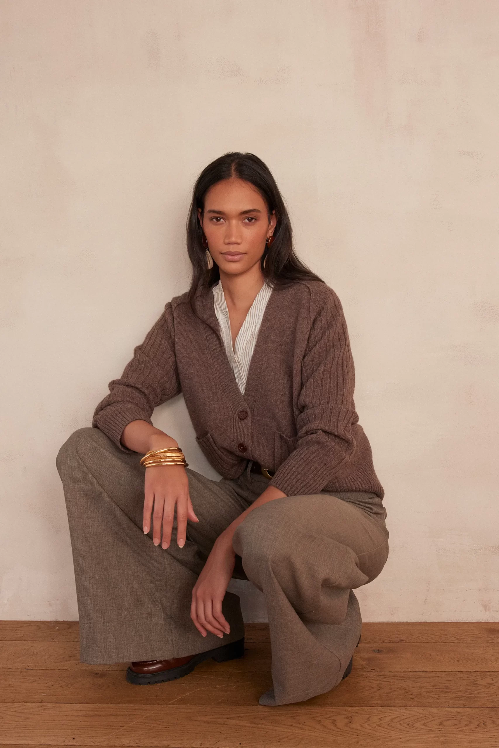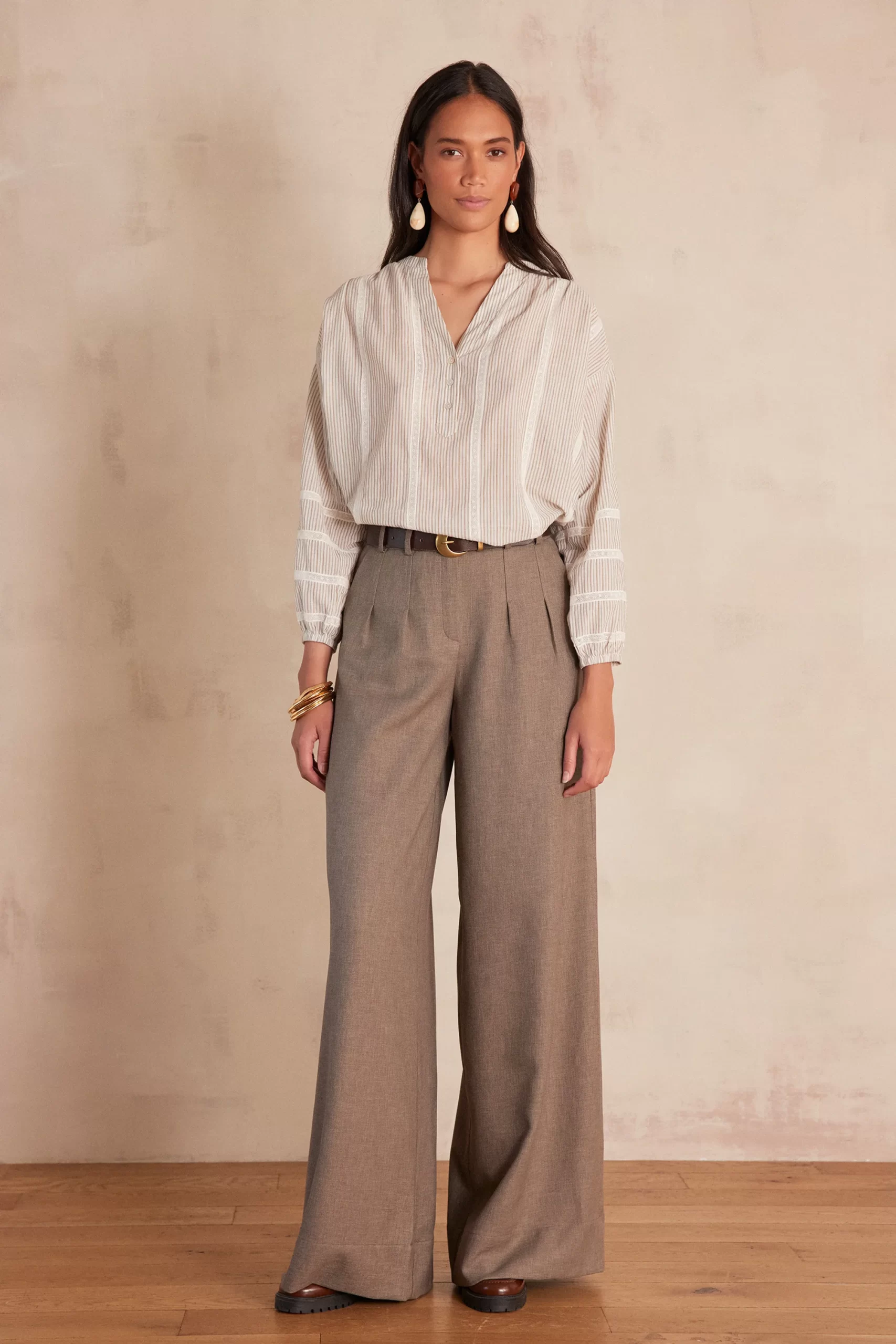 Tia is 1m78 tall and wears a size 34. With the DAISY trousers, the model wears the BALDWIN cardigan, the SALOME blouse and the VALENTIN loafers.