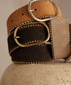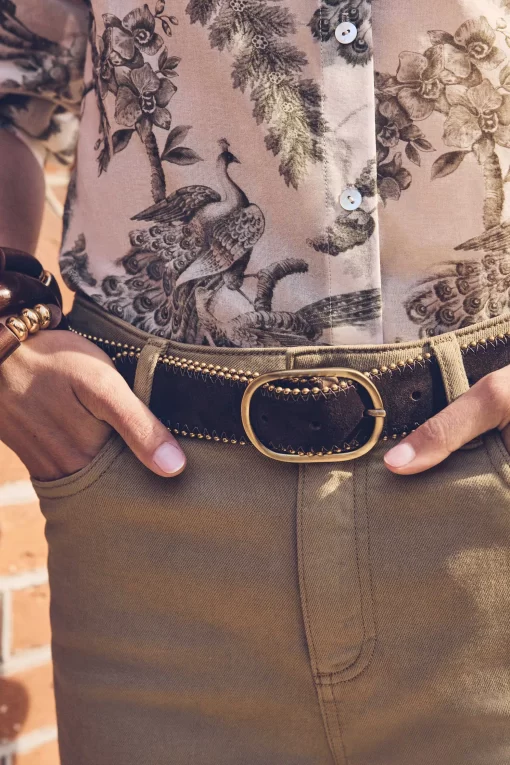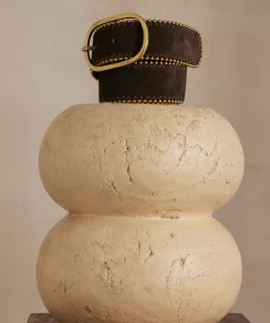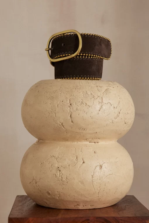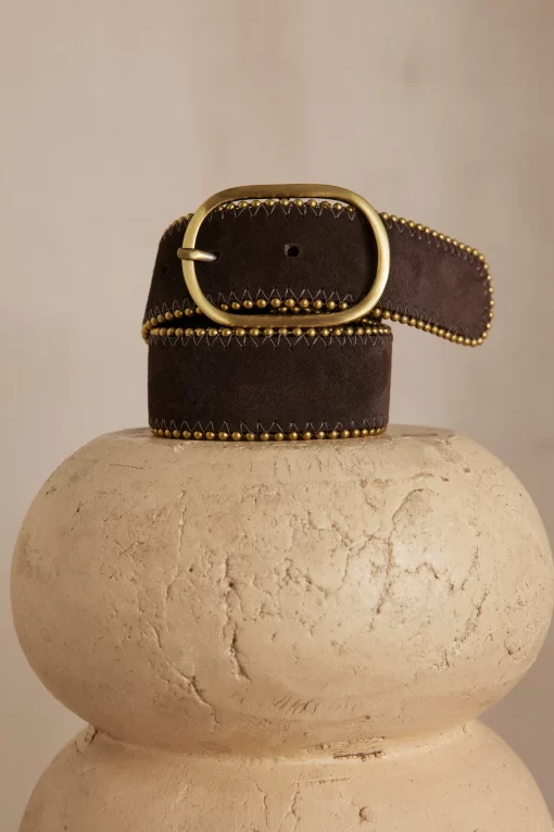 We love its timeless chocolate suede leather edged with small champagne studs. Its shiny buckle will perfectly adorn your looks