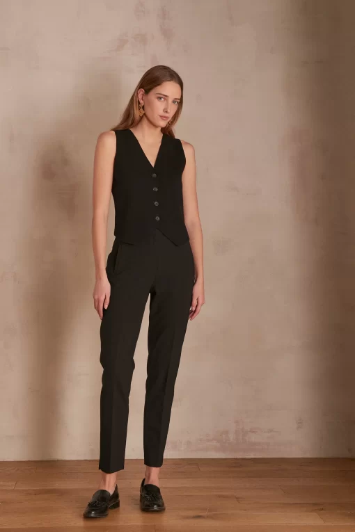 Louise is 1.75m tall and wears a size 36. The model is wearing NAYA waistcoat, REINE jacket and ROSA loafers with the LARA trouser.trousers