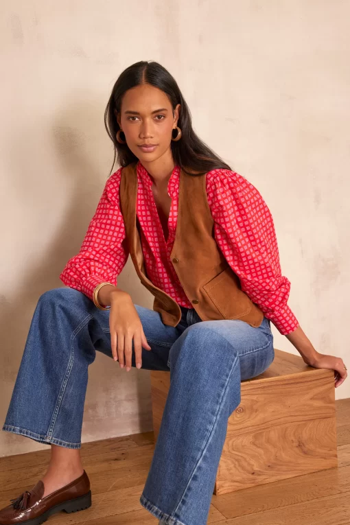 Tia is 1m78 tall and wears a size 34. With THE PERLIN cardigan, the model wears the BETH blouse, SANDY jeans and VALENTIN loafers.