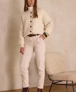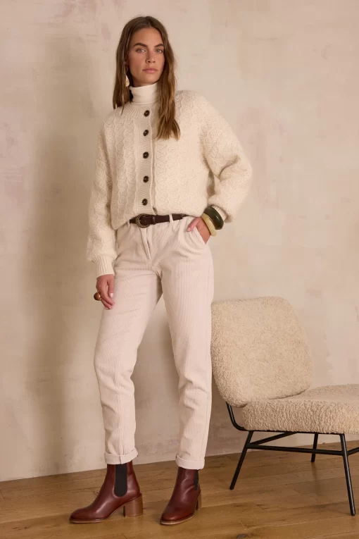 CARMEN is 1.72m tall and wears a size 36. With the SABIL trousers, the model wears the FERGUIE turtleneck T-shirt and the COSMO cardigan.This model fits true to size
